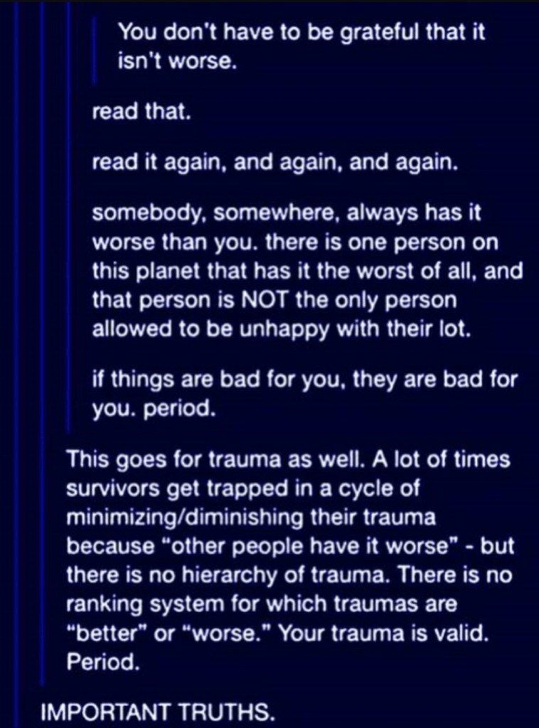 I’ve been taught to think that someone always has it worse and to be grateful that it isn’t worse. But lately I’ve been thinking that it’s okay to have moments where you are unhappy. As below says, if things are bad for you, things are bad. I shouldn’t feel guilty for feeling the way I do. My trauma is valid.