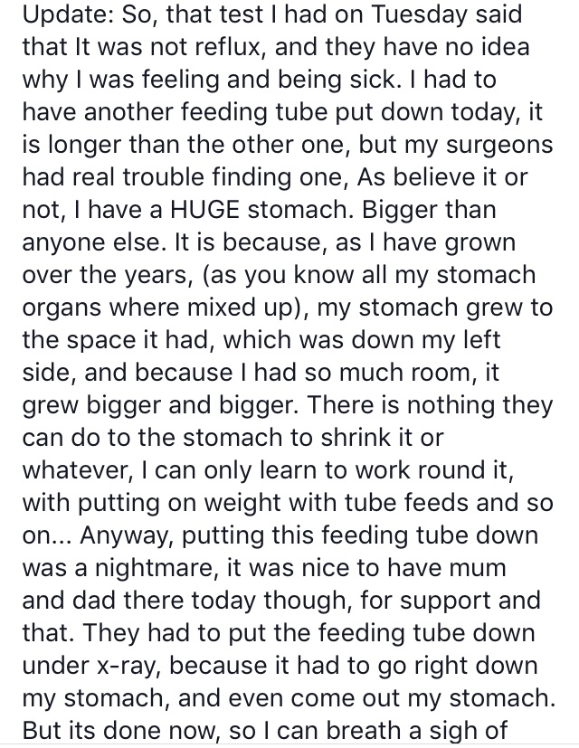 There is no name for what I’ve got in general. So I gave a very brief outline of my life. I was born with my organs on the outside of my body (there is a name for that I know – exomphalos) , I’ve had complications throughout my life resulting in me having major stomach surgery, I now have a tube in my stomach etc etc.