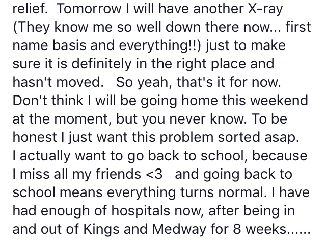 I made such good progress in such a short amount of time (I think it was just because I was soo determined to get back to normality that I really pushed myself!). After about 2 weeks of being an inpatient, I was sent home. Everyone was so impressed with my progress that they felt that I could go home. I remember asking my consultant when I could go back to school and he replied “give it at least a week”. I was gutted, I wanted to go back the next day! πŸ˜‚πŸ˜‚
