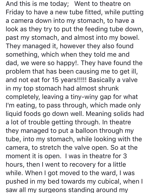 So they found that by inserting a balloon inside of me… they could open up the top stomach valve which was almost so tightly shut .. so much so food was struggling to go down.