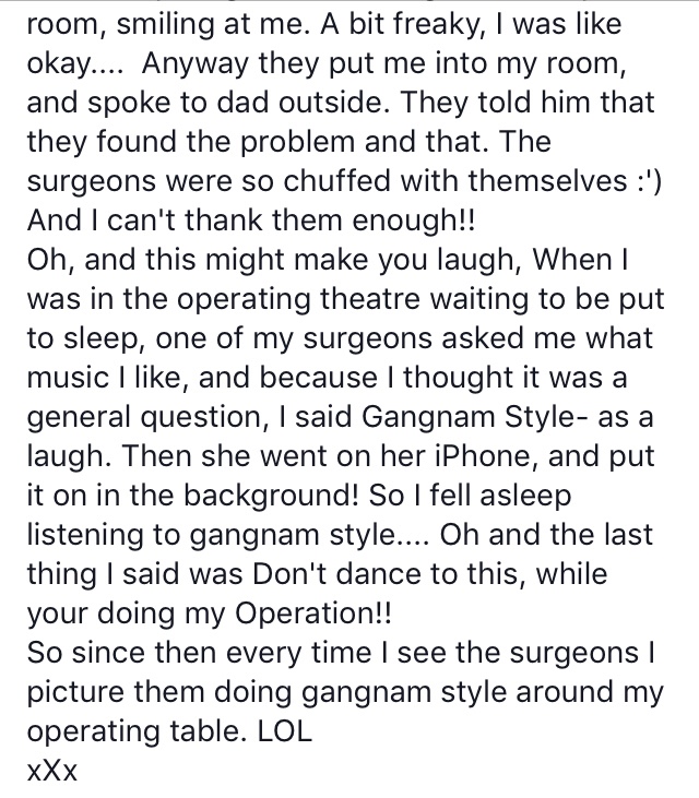 Oh and the ‘Gangnam style’ situation …. I can still, to this day see my surgeon and his team dancing around the operating table to it…