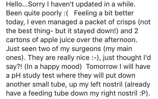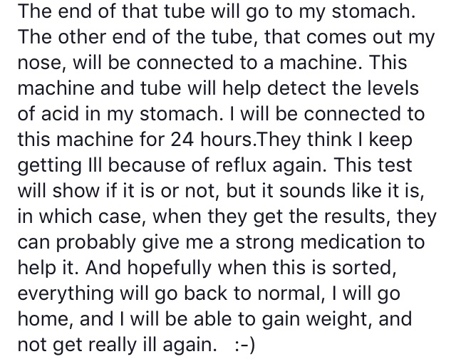 I remember this PH Test… I had that tube down one nostril and my feeding tube down the other nostril … it was like my nose was a bloody charging socket! 🀣